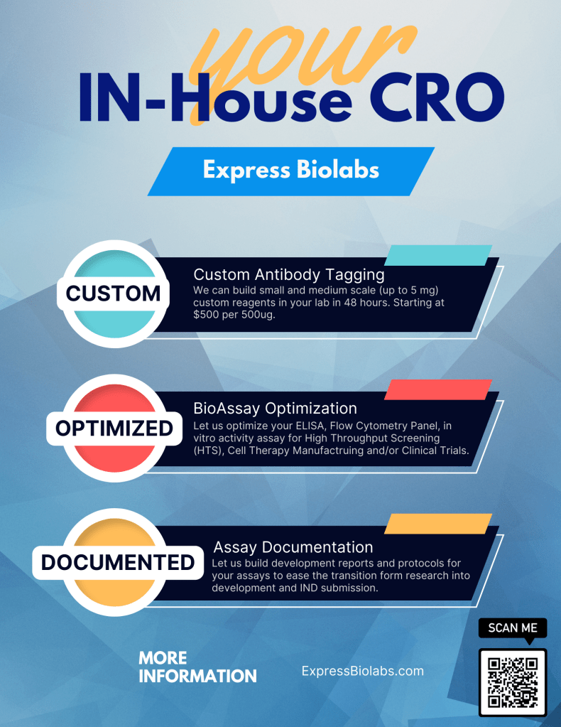 Express Biolabs “helped us at E11 Bio with a set of custom antibody-fluorophore conjugations by NHS-ester chemistry in just 2 days on-site in our lab. He also built a site-specific maleimide conjugation technology that can work with DNA and other larger molecules.”